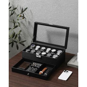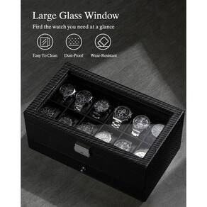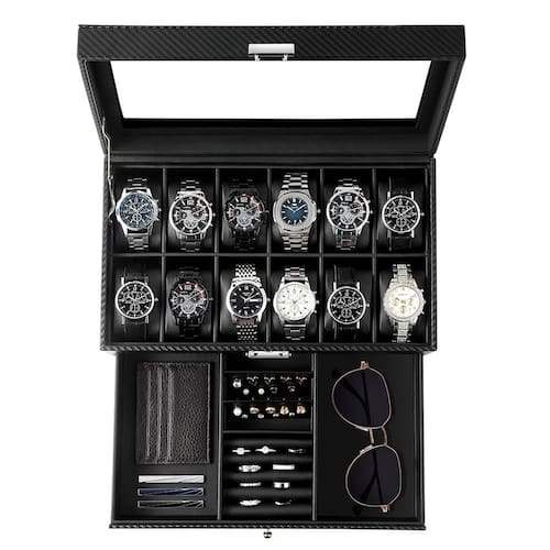 GUKA Caixa de relógio, caixa de relógio com 12 compartimentos, capas de relógio para homens com tampa de vidro real, armazenamento organizador de relógio de couro sintético com caixa de joias, aniversário para homens e mulheres, preta - [Camada dupla]: na camada superior da caixa de joias, há 12 compartimentos para relógio com almofadas de veludo removíveis. E na camada inferior, há uma área adequada para suas abotoaduras, colares, pulseiras, brincos, broches, óculos de sol e quaisquer outras joias e pertences - [Artesanato de alta qualidade]: feita de couro sintético preto de qualidade e veludo macio, esta caixa de joias é superexcelente para proteger suas amadas joias de arranhões e danos - [Tampa de vidro real grande]: a tampa de vidro real protege seus relógios contra poeira, oferece uma visão aberta dos relógios exibidos. Esta pode ser uma exibição perfeita do seu relógio - Ótimo presente: dê a seus amigos e familiares um presente que eles vão adorar. Esta caixa de relógio é ideal para profissionais, empresários, amantes de joias e todos os outros - [Ainda não satisfeito]: nossa equipe de serviço está sempre à sua disposição - então não espere mais e leve esta nova caixa de relógio a caminho de sua casa hoje