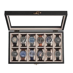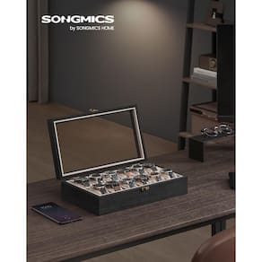 Suas coleções de relógios merecem uma caixa de relógio de qualidade, e esta caixa SONGMICS é uma boa escolha para colecionadores de relógios. Resumo das vantagens desta caixa de relógio de madeira SONGMICS com 12 compartimentos: - Rústico e elegante: dá aos seus relógios de bom gosto uma casa de bom gosto. - Resistente e protetor: Feito com madeira maciça e forro de veludo para proteção total. - Tampa de vidro: tornando-a uma ótima caixa de exibição de relógio e ajudando a encontrar seu relógio mais facilmente. - Almofadas de relógio: as almofadas macias mantêm seus relógios na forma correta. - Multifuncional: remova os travesseiros, e é ótimo para armazenar anéis, abotoaduras e colares. - Ótima ideia de presente: ideal para aniversários, aniversários e formaturas. Especificações: - Cor: preto ébano - Material: Madeira Paulownia, forro de veludo, vidro - Tamanho do produto: 21 x 35 x 8,5 cm. - Peso do produto: 1,2 kg Conteúdo da embalagem: - 1 caixa de relógio. Observações SONGMICS - Mantenha a caixa do relógio longe da umidade. - Para cuidados diários, limpe com um pano macio. - Estilo sua coleção de relógios] Com madeira maciça rústica com grão rico e um grande vidro transparente, esta caixa de relógio de madeira não apenas atende às suas necessidades de armazenamento, mas também acentua sua coleção de relógios e adorna seu espaço - Materiais de qualidade, proteção total] Feita com uma moldura de madeira maciça por fora e veludo macio por dentro, esta caixa de relógio oferece proteção total para seus relógios contra acidentes e arranhões. Os travesseiros macios e de suporte os mantêm em boa forma - [Armazena até 12 relógios] Com 12 compartimentos, esta caixa de relógio permite que você coloque seus relógios com um tamanho de mostrador de até 51 mm, tudo em um local conveniente, para que você possa encontrar facilmente o relógio certo sem procurar infinitamente - [Tampa de vidro transparente] Exiba seus relógios, mantenha seus relógios limpos de poeira, ajuda você a encontrar seus relógios mais facilmente ou decidir qual relógio usar hoje sem abrir a tampa - esta tampa de vidro preenche todas as caixas - [Presente para entes queridos] Seja para um aniversário, aniversário ou outros dias especiais, este suporte de relógio é um presente que induz sorrisos para qualquer entusiasta de relógios