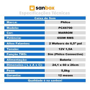 A Alto Falante Acústica Philco PCX6700 Bluetooth FlashLight 650W Bivolt garante a você uma incrível experiência sonora! Curta suas músicas favoritas com a tecnologia EX Bass, que aliado aos 650W de potência, entrega um som muito mais intenso e marcante.