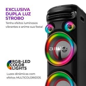 Caixa de Som AIWA Torre: Potencia de 2300W RMS, som de alta fidelidade e luzes vibrantes para animar sua festa.
