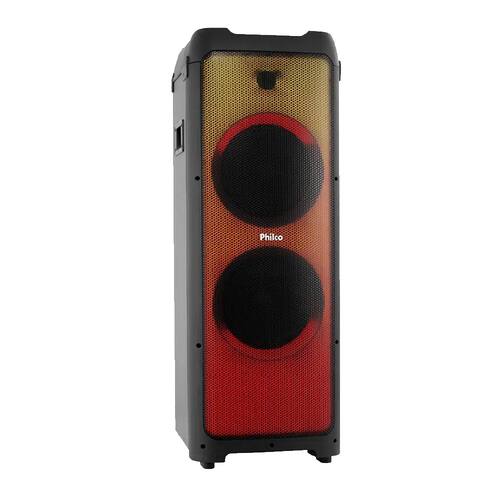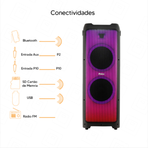 Philco Connection (TWS) para fácil emparelhamento com outros dispositivos. Contendo funções USB para reproduzir arquivos de música diretamente de um dispositivo USB, Slot para cartão SD para reproduzir arquivos de música de um cartão SD, Rádio FM para sintonizar suas estações de rádio favoritas e 2 entradas P10 para ligar seu microfone ou instrumento musical.