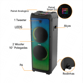 Com 2 woofers de 10 polegadas, 1 tweeter e para um som equilibrado e rico, para sentir toda intensidade sonora.