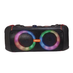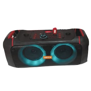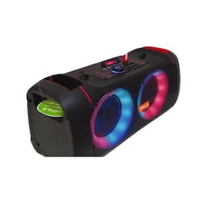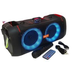 Caixa de som com leds RGB, entrada para dois microfones e alça para descolamento.