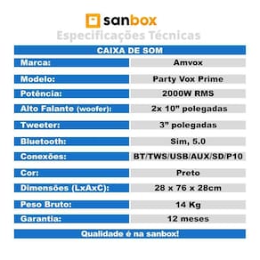 A caixa de som amplificada bluetooth preta led amvox party vox prime 2000w rms é poderosa e implacável com sistema de som de altíssima qualidade, fidelidade sonora e muita potência para você aproveitar cada momento enquanto escuta suas músicas favoritas. Se surpreenda com party vox prime, impossível ficar parado. Recheado de funcionalidades a party vox oferece conexões e tecnologias como bluetooth, tws e power x, mas você também pode reproduzir músicas através de entradas físicas, como pen drive, usb ou até mesmo cartão de memória. Além disso, ela também tem entrada duas entradas p10 para a conexão de microfone e instrumentos musicais. Totalmente versátil essa caixa possui tecnologias como double coil e o tws que permite conectar duas caixas amvox party vox prime sem a necessidade de fios, com isso, você dobrar a potência e criar uma imersão maior ao escutar suas músicas favoritas. Já a tecnologia power x torna possível que duas caixas funcionem simultaneamente conectadas a um smartphone, com um aumento significativo de potência. Separadas, elas funcionam de maneira independente, proporcionando um ganho de versatilidade. Existe duas incríveis funções presentes nessa caixa, a função microfone prioridade e a função troca de pastas. A função microfone prioridade abaixa o volume da música e dá prioridade no áudio do microfone, já a função troca de pastas permite você navegar por pastas podendo escolher avançar ou retroceder para pasta desejada. Seu design é minimalista e elegante o painel em led e as principais funções da caixa estão localizadas na parte superior para proporcionar mais conforto e praticidade. Essa caixa de som é equipada com incrível show de led no painel frontal. Além disso, ela conta com rodinhas e alças para facilitar o transporte e dutos de ar para melhorar a acústica. São 2000w rms de pura potência a party vox prime é equipada com dois woofer de 10 polegadas e um tweeter de 3 polegadas. Além disso, ela possui uma bateria interna recarregável com até 4 horas. Use-o onde quiser, este dispositivo é projetado para você ter sempre a melhor experiência sonora, com garantia de qualidade amvox. Especificações -marca: amvox -modelo: party vox prime -gtin/ ean: 7898649371642 -cor: preto -design: portátil -sistema de iluminação: show de led -display: led -potência: 2000w rms -alto-falante: 2 woofer 10 polegadas -tweeter: 3 polegadas -com bateria interna: sim, bateria recarregável -capacidade da bateria: 7500 mah -autonomia da bateria: 4 horas -suporta bateria externa: não -frequência: 50hz - 60hz -impedância: 4 ohms -relação sinal ruído: 95db -função bluetooth: sim -versão do bluetooth: 5.0 -alcance do bluetooth: 10m -função tws: sim -função power x: sim -double coil: sim -função microfone prioridade: sim -função troca pasta: sim -função karaokê: sim -com equalizador: sim -controle de graves e agudos: não -função gravar rec. : sim -função repeat: sim -função mega bass: sim -rádio: não aplica -controle remoto: sim -conexões entradas : bt/ tws / usb /aux /sd / 2x p10 -alça de transporte e rodas: sim -anatel/inmetro: 11740-20-11984 -entrada para pedestal: nâo -material: polietileno -voltagem: bivolt -INMETRO/ANATEL: 11740-20-11984 -dimensões l x a x c : 28 x 76 x 28cm -peso: 12 kg -peso bruto: 14 kg Itens inclusos -01 caixa amplificada amvox party vox prime -01 controle remoto -01 cabo de energia -01 manual Garantia -garantia de fábrica: 12 meses
