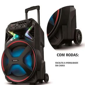Com varios canais de entrada, voce pode reproduzir suas musicas via Bluetooth direto do celular, sem cabos. Alem das entradas USB e AUX, que permitem conectar pen drive, MP3, MP4, microfone ou guitarra.