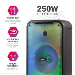 Durabilidade e conectividade Sua bateria recarregáveis oferece até 9 horas de autonomia, garantindo que a festa dure por muito mais tempo. Enquanto, sua tecnologia Philco Connection e Bluetooth 5.0 possibilitam a conexão com múltiplas unidades.