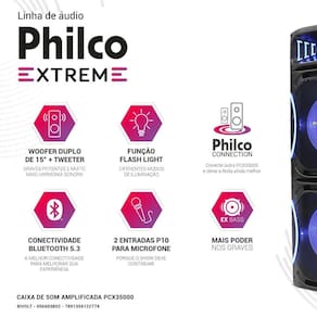 A Caixa de Som Amplificada Philco PCX35000 é um sistema de som de alta potência, ideal para festas e eventos. Com design robusto e moderno, ela oferece 3500W de potência em dois woofers que garantem graves intensos e profundos. Possui conectividade Bluetooth, permitindo o pareamento fácil com smartphones e tablets para reprodução de músicas sem fio. Além disso, conta com entradas USB e para cartão de memória, possibilitando diversas opções de conexão.