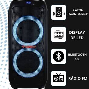 Especificações Técnicas: - 2 alto-falantes de 8” - Antena interna - Adaptador bivolt ac 110v-240v - Bateria interna 7.4v 1800mah x2 lithium recarregável - Bluetooth 5.0 - Contole remoto - Cabo usb - Entrada auxiliar - Microfone ou guitarra x 2 - Usb - Função tws - Gravação - Repetir - Frequência de resposta: 55hz - 20khz (+/-3db) - Impedância: 4 ohms - Iluminação frontal led - Leitor de cartão - Microfone com fio - Potência 1000 w rms - Rádio fm - Sensibilidade: 85db - 1 tweeter