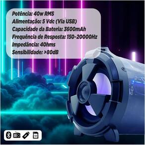 Potência real de 40W RMS Conexão Bluetooth 5.0 + EDR para maior alcance e estabilidade Entradas USB, MicroSD, AUX P2 e microfone com ajuste de volume Design portátil estilo canhão com alça de transporte Bateria recarregável de longa duração Voltagem Bivolt 110/220V