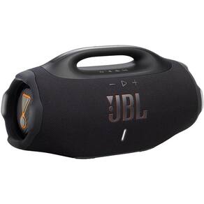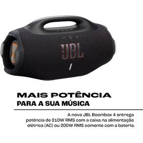 SOM JBL PRO COM AI SOUND BOOST. A Boombox 4 traz dois woofers maiores, dois tweeters e três radiadores passivos para som nítido e potente. A tecnologia AI Sound Boost ajusta o áudio em tempo real para mais potência e menos distorção.