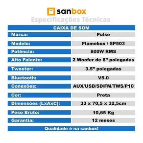 Especificações Técnicas: -marca: Pulse -modelo: Flamebox -modelo Alfanumérico: SP503 -cor: Preto -design: Portátil -sistema de Iluminação: LED -potência: 800W RMS -alto-falante: 2 Woofer de 8polegadas -tweeter: 3.5 polegadas -frequência de Resposta: 50Hz - 20KHz +/-3db -sensibilidade: 60db +/-2db -impedância: 4 Ohms -função Bluetooth: Sim, V5.0 -alcance do Bluetooth: 10 metros -função TWS: Sim -ajuste de Graves e Agudos: Sim -função Repetir: Sim -função Gravar REC. : Sim -função Troca de Pastas: Não -bateria: Recarregável -capacidade da Bateria: 5000 mAh -autonomia da Bateria: 6 horas em 50% do Volume -tempo de Carga: 5 horas -voltagem: Bivolt Automático -rádio: FM -controle Remoto: Sim -conexões Entradas : BT/ AUX / USB / SD /FM / TWS / P10 -entrada AUX: P2 -entrada Para Suporte Tripé: Não -alça para Transporte: Sim -com Rodinhas: Não -dimensões L x A x C : 33 x 70,5 x 32,5cm -peso: 10,5 Kg -peso Bruto: 10,65 Kg
