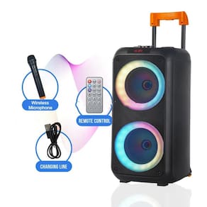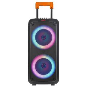 Conta ainda com entrada USB, auxiliar P2, cartão de memória, rádio FM e microfone, além de controle remoto para facilitar o uso à distância. A bateria recarregável proporciona horas de reprodução sem depender de tomadas.