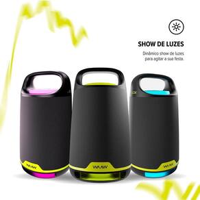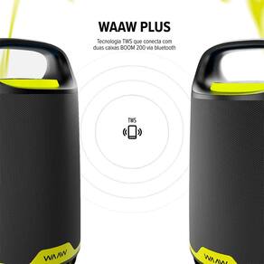Caixa de som bluetooth waaw boom 200 80w O boom certo para sua festa precisa estar no volume máximo para isso, conte com a waaw boom 200. A caixa de som bluetooth de 80w rms de potência possui proteção ipx4, que a torna à prova de respingos, para você levar a festa para onde você quiser curtir com a galera. Sincronize as luzes com suas músicas favoritas e esquente a pista de dança com o show de luzes dinâmico da boom 200. Personalize a playlist e divirta-se transmitindo suas canções sem fio via bluetooth v5.3, que garante estabilidade e alcance para que a música continue sem interrupções. Equipada com três alto-falantes, um subwoofer e dois tweeters, a caixa de som bluetooth waaw oferece um som envolvente, onde graves, médios e agudos são reproduzidos com clareza. Além do seu design moderno e elegante, a boom 200 eleva o impacto dos graves com o recurso power bass, para uma nova sensação de poder a cada play. De longa duração, com apenas uma recarga, a bateria da waaw boom 200 reproduz até 12 horas Sem comprometer a qualidade do áudio. Quando o volume máximo de uma caixa de som bluetooth não for o suficiente para sua festa, emparelhe até dois alto-falantes sem fio ao mesmo tempo com a tecnologia waaw plus. A speaker bluetooth da waaw é a melhor escolha para acompanhar o rolê. Com sua alça ergonômica de fácil empunhadura, o som de qualidade está garantido em qualquer lugar. Conecte seus dispositivos favoritos, como smartphones, tablets, laptops ou até mesmo um microfone, utilizando a entrada usb e a entrada auxiliar in, e solte a voz. Experimente potência e qualidade de som em qualquer lugar com o estilo único da waaw boom 200 seja para animar a festa, criar uma atmosfera diferente durante reuniões ou apenas relaxar em casa, a caixa de som bluetooth se adapta ao clima e você aproveita cada momento ao máximo. Ficha técnica - conectividade app: não - material: polímeros e tecido - versão do bluetooth: 5.3 - tempo de reprodução de música: 12 - potência de saída rms : 80w - grau de proteção: ipx4 - tipo de conexão do cabo de carregamento: usb-c - impedância do speaker: tweeter: 4 ohms / woofer: 4 ohms - resposta de frequência: 70hz 20khz - perfis bluetooth: a2dp/avrcp/vdp/hfp - alcance máximo: 10m - desligamento automático: sim, em 10 minutos - cor: preto e verde - acompanha cabo p2 m : não - entrada para cartão sd: não - controle com botões: sim - microfone integrado: não - tamanho do speaker polegada : 1x 5 subwoofer + 2x 2,75 tweeter - número de tweeters: 2 - número de woofers: 1 - bateria mah : 4400 - tipo de bateria: íons de lítio - entrada cabo de áudio 3,5 mm: sim - rádio fm: não - iluminação em led: sim - reforço de grave: sim - número de canais de som: 2 l/r - configuração do driver: unidirecional - entrada para microfone quant. E mm : 1 entrada / p10 6,35mm - entrada de guitarra quant. E mm : não - entrada usb: sim - saída de áudio: mp3 / wav / wma - fonte de alimentação: sim - power bank: não - tws: sim - acessórios: carrregador; cabo usb-c - componentes: 2x tweeter; 1x woofer; pano protetor; painel de botões; tampa com conexões; conexões; suporte pegador; suporte base - : produto: 1 ano 3 meses de legal e mais 9 meses de especial concedida pelo fabricante . Bateria: 6 meses 3 meses de legal e mais 3 meses de especial concedida pelo fabricante Dimensões e peso do produto 19,3 x 19,3 x 34 cm / 3,14 kg cxlxa Dimensões e peso da embalagem 24 x 24 x 38,7 cm / 3, 3kg cxlxa Homologação Anatel: 191302315167