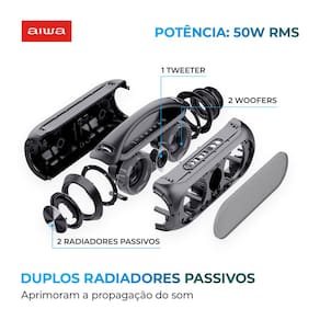 O Boombox AWS-BBS-02-A é garantia de uma performance de áudio surpreendente! O lançamento com a assinatura AIWA, tem potência de 50W RMS e dois radiadores passivos laterais que atuam em conjunto com os alto-falantes para aprimorar a propagação do som. Portátil, o Boombox tem design compacto e moderno, alça para transporte e bateria carregável e bivolt. Saiba mais sobre AWS-BBS-02-A da AIWA:
