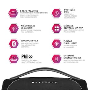 Bateria Interna Duração de bateria 30h em 50% do volume, Ex Bass desligado e iluminação desligada LED indicador de carga de bateria LED indicador de conexão Bluetooth Potência de áudio declarada: 300w Quantidade do Midrange: 2 unid Quantidade do Tweeter: 2 unid Quantidade do Subwoofer: 1 unid Tempo para carregar 100%:4h À prova de respingos dágua: IP66 Efeitos luminosos - Flash Light: customizável pelo App Perfil de equalização sonora: Customizável pelo App Philco Connection (TWS) Reforço de graves ExBass Conjunto de alto-falantes: Sistemas de 3 vias estéreo.