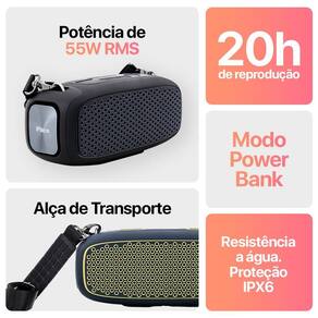 Especificações Potência: 55W RMS Resistência a água: IPX6 Bluetooth: 5.0+EDR, suporte para iOS e Android Distância máxima Bluetooth: 10 metros Resposta de frequência: 60 Hz – 12 kHz Bateria: Lítio 7,4V / 8000 mAh Tensão de carregamento: DC 5V 2A Autonomia bateria: até 20h, conforme utilização* Tempo de carregamento: aproximadamente 4h Entradas: USB-A, P2 (3,5mm) e Micro SD (TF) Modo Power Bank Modo Chamada (hands free) Função TWS (conecte duas caixas ao mesmo tempo) 3 equalizações pré-definidas (Neutro, Grave, Médio) Indicador de carga da bateria