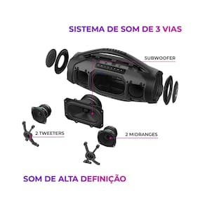 Reunir nossa família e amigos e desfrutar de uma boa música é um dos prazeres da vida, né? Curta um som potente e de alta definição com a Boombox Plus! A caixa de som foi projetada com sistema de som de 3 vias - 1 subwoofer, 2 midranges e 2 tweeters -, além de ter dois radiadores passivos laterais, 200W RMS de potência e o DNA japonês da marca AIWA. Com o certificado IP66, você e sua turma podem ouvir sua playlist favorita na beira da piscina ou na praia sem preocupação, já que a Boombox é resistente a jatos potentes de água e tem proteção total contra poeira. Incrível, né? Saiba mais sobre a Boombox Plus: 200W RMS de potência Sinta a experiência sonora impactante com os 200W RMS de potência da caixa portátil AIWA. Você será levado pela música com graves mais profundos e som potente. E, com a tecnologia Energy Saving, você mantém os 200W de potência até ouvindo música na bateria (fora da tomada).