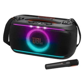 Design portatil com alca para transporte, bateria recarregavel, resistencia a agua e microfone incluso para karaokes e apresentacoes.