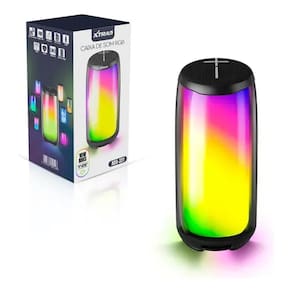 O modelo conta com iluminação decorativa integrada, que proporciona um visual agradável enquanto o som é reproduzido. A bateria de longa duração garante várias horas de uso contínuo, ideal para quem busca praticidade no dia a dia.