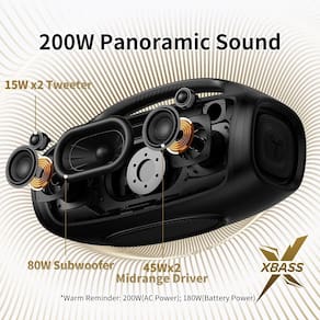 Saída explosiva de 200 W* Com um subwoofer de 80 W com reforço de diamante, dois drivers de médio alcance de 45 W e dois tweeters de domo de seda de 15 W, o StormBox Blast 2 oferece batidas e notas precisas. Seu design de 2.1 canais, alimentado por dois amplificadores TI avançados, garante um som equilibrado e dinâmico, enquanto dois radiadores passivos grandes realçam os graves para uma ressonância mais profunda. (Alimentação CA: 200 W; Energia da bateria: 180 W)