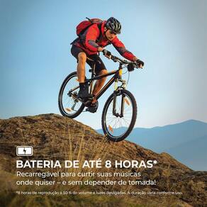 Conta com entrada USB com função passa-pasta e bateria recarregável de até 8 horas, perfeita para curtir música sem depender de tomada. Sua certificação IPX6 garante resistência contra jatos fortes de água, possibilitando o uso em ambientes externos e úmidos.