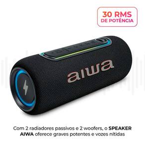 Caracteristicas: Caixa de Som Marca: Aiwa Modelo: AWS-SP-05-LB Potencia: 30w Cordao de transporte: Leve seu speaker para onde quiser. Duracao da Bateria: 6 horas Protecao IPX LED Color Light Entrada USB com funcao passa pasta: Bluetooth: 5.3 2 radiadores passivos laterais Reforcam os graves com mais profundidade e clareza, permitindo um som potente.