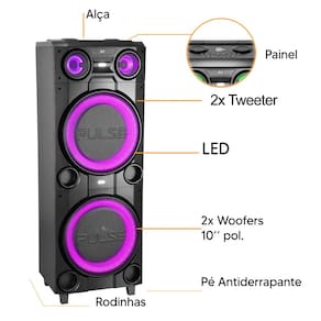 A Caixa de Som Torre Pulse SP517 Double 10” TWS Bluetooth – 2500W é feita para quem quer potência de verdade e presença marcante. Com 2500W de potência e dois woofers de 10 polegadas, ela entrega graves profundos, médios encorpados e agudos nítidos, criando uma experiência sonora intensa para festas, eventos e ambientes amplos.