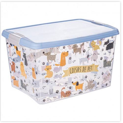 Descrição: Esta caixa organizadora da Plasútil é decorada com tema Pet, ideal para armazenar diversos itens do seu animal de estimação, como brinquedos, ração, acessórios, entre outros. Possui tampa com travas laterais que garantem o fechamento seguro, protegendo o conteúdo contra poeira e umidade. Fabricada em plástico PET resistente e livre de BPA, oferece durabilidade e segurança.
