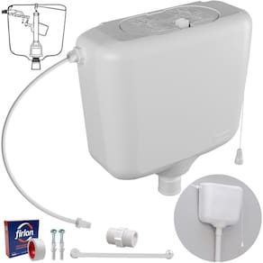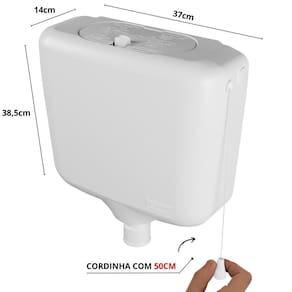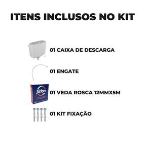 Caixa de descarga elevada de 6,8 à 9l branca + engate + fita veda rosca Caixa de descarga elevada de 6,8 à 9l branca astra A caixa de descarga elevada astra é um sistema de descarga de água utilizado em banheiros que é instalado na parede acima do vaso sanitário. Essa caixa é conhecida por ser uma solução eficiente para a economia de água, uma vez que permite controlar a quantidade de água liberada a cada descarga. A caixa de descarga é produzida em materiais resistentes e duráveis, o que garante sua longa vida útil. Sua instalação é fácil e acompanha um kit de fixação, que permite a colocação do produto de forma segura e prática. Uma das vantagens é que ela pode ser utilizada em conjunto com vasos sanitários de diferentes modelos e tamanhos. Isso faz com que ela seja uma opção versátil para diferentes tipos de banheiros, sejam eles residenciais ou comerciais. Além disso, a caixa de descarga elevada astra possui um design moderno e elegante, que contribui para a decoração do banheiro. No geral, a caixa de descarga elevada astra é uma solução prática e eficiente para quem busca economizar água e ter um banheiro mais moderno e funcional. Especificações técnicas Material: pvc Pressão de trabalho: 2 - 40mca Manual: sim Capacidade: 6,8 - 9l Dimensões do produto: 37,08 x 33,86 x 13,7cm Compatibilidade: bacias 6 lps e mais antigas Cor: branco Acabamento: brilhante do fabricante: 90 dias Engate mangueira flexível para descarga 40cm x 1/2 branco astra Um engate flexível para descarga é um dispositivo para conectar um cano de esgoto ou uma mangueira de descarga a uma fonte de escoamento, como uma pia, banheira ou vaso sanitário. Ele é projetado para ser flexível, permitindo que ele se dobre e se mova sem quebrar ou vazar. O engate flexível é uma alternativa conveniente e eficaz aos tubos de esgoto rígidos, especialmente em situações onde a instalação de um cano rígido não é viável devido à falta de espaço ou à dificuldade de manobra. Além disso, o engate flexível pode ser facilmente removido e substituído, o que o torna uma opção popular para instalações temporárias ou em reformas de banheiros e cozinhas. Especificações técnicas Material: pvc flexível Temperatura indicada: somente água fria Pressão: 40 m.C.A Diâmetro: 1/2 Tipo de corpo: macho-fêmea e fêmea-fêmea Cor: branco Acabamento: brilhante do fabricante: 90 dias Fita veda rosca teflon 12mm x 5m firlon A fita veda rosca teflon firlon é produzida pela plastifluor que líder de produção para o mercado brasileiro. Produto com excelência em qualidade, supera a norma abnt nbr 16368:2015. Especificações técnica Composição química: ptfe poli-tetra-fluor-etileno . Aplicação: vedação de roscas e conexões em tubulações de água fria, água quente, vapor, combustíveis, fluidos e gases em geral. Temperatura de trabalho: de - 90c até +240c. Resistência química: material de baixíssima reatividade química, resistente aos líquidos e gases comumente utilizados em instalações industriais como: ácidos, bases, solventes, combustíveis, lubrificantes, vapor, gases de processo etc. Compatibilidade com oxigênio: compatível com oxigênio líquido ou gasoso em temperatura ambiente e criogênicas. Consultar quanto ao uso acima de 50c. Tolerâncias dimensionais: sempre maior ou igual que a espessura e densidade mínima. O kit segue com todos os itens para montagem e pronto para uso após a instalação A se aplica a todo e qualquer vício ou defeito aparente ou que não estejam em conformidade com o produto. - 90 dias para a caixa elevada - 90 dias para o engate Itens inclusos 01 caixa de descarga elevada 01 engate 01 rolo de fita veda rosca 12mm x 5m 01 régua suporte 01 de vazão 02 niples 02 buchas s6 02 parafusos 3 x 30mm