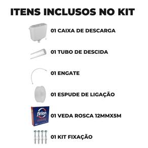 Caixa de descarga elevada de 6,8 à 9l branca + tubo de descida + espude + engate + fita veda rosca Caixa de descarga elevada de 6,8 à 9l branca astra A caixa de descarga elevada astra é um sistema de descarga de água utilizado em banheiros que é instalado na parede acima do vaso sanitário. Essa caixa é conhecida por ser uma solução eficiente para a economia de água, uma vez que permite controlar a quantidade de água liberada a cada descarga. A caixa de descarga é produzida em materiais resistentes e duráveis, o que garante sua longa vida útil. Sua instalação é fácil e acompanha um kit de fixação, que permite a colocação do produto de forma segura e prática. Uma das vantagens é que ela pode ser utilizada em conjunto com vasos sanitários de diferentes modelos e tamanhos. Isso faz com que ela seja uma opção versátil para diferentes tipos de banheiros, sejam eles residenciais ou comerciais. Além disso, a caixa de descarga elevada astra possui um design moderno e elegante, que contribui para a decoração do banheiro. No geral, a caixa de descarga elevada astra é uma solução prática e eficiente para quem busca economizar água e ter um banheiro mais moderno e funcional. Especificações técnicas Material: pvc Pressão de trabalho: 2 - 40mca Manual: sim Capacidade: 6,8 - 9l Dimensões do produto: 37,08 x 33,86 x 13,7cm Compatibilidade: bacias 6 lps e mais antigas Cor: branco Acabamento: brilhante do fabricante: 90 dias Tubo para caixa de descarga sobrepor 1,50m astra O tubo para caixa de descarga é um acessório utilizado em sistemas hidráulicos de descarga em banheiros. Ele é projetado para ser instalado na parede, sobre a caixa de descarga, e tem 1,50 metros de comprimento. Especificações técnicas Material: pvc : 90 dias Pressão de trabalho: 2 - 40mca do fabricante: 90 dias Engate mangueira flexível para descarga 40cm x 1/2 branco astra Um engate flexível para descarga é um dispositivo para conectar um cano de esgoto ou uma mangueira de descarga a uma fonte de escoamento, como uma pia, banheira ou vaso sanitário. Ele é projetado para ser flexível, permitindo que ele se dobre e se mova sem quebrar ou vazar. O engate flexível é uma alternativa conveniente e eficaz aos tubos de esgoto rígidos, especialmente em situações onde a instalação de um cano rígido não é viável devido à falta de espaço ou à dificuldade de manobra. Além disso, o engate flexível pode ser facilmente removido e substituído, o que o torna uma opção popular para instalações temporárias ou em reformas de banheiros e cozinhas. Especificações técnicas Material: pvc flexível Temperatura indicada: somente água fria Pressão: 40 m.C.A Diâmetro: 1/2 Tipo de corpo: macho-fêmea e fêmea-fêmea Cor: branco Acabamento: brilhante do fabricante: 90 dias O kit segue com todos os itens para montagem e pronto para uso após a instalação A se aplica a todo e qualquer vício ou defeito aparente ou que não estejam em conformidade com o produto. - 90 dias para a caixa elevada - 90 dias para a tubo de descida - 90 dias para o engate - 90 dias para o espude Itens inclusos 01 caixa de descarga elevada 01 tubo para descarga 01 engate 01 espude 01 rolo de fita veda rosca 12mm x 5m 01 régua suporte