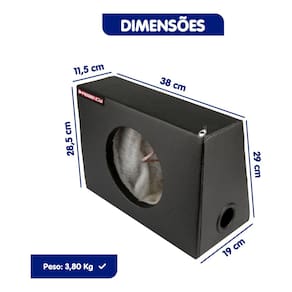 CARACTERÍSTICAS: - Design Durável: A caixa é feita de MDF de 15 mm com acabamento em courvin perfurado preto, combinando estilo e resistência. - Eficiência: Com volume de 15 litros e um duto frontal de 2", a caixa otimiza o desempenho do subwoofer para som de alta qualidade. - Fácil Instalação: Plugs parafusados e terminais de conexão facilitam a instalação e o ajuste do sistema de som.