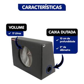 ESPECIFICAÇÕES TÉCNICAS DA CAIXA: - Material: MDF 15-18 mm - Design: 1 Duto de 2 polegadas lateral. - Volume: 17Litros. - Acabamento: Courvin perfurado preto. - Conexões: Plugs parafusados com fio. - Construção: Cola branca com serragem e manta acrílica.