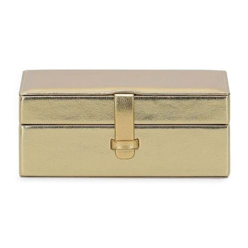 Esta caixa em MDF com revestimento em PU dourado possui acabamento elegante e estrutura firme, ideal para guardar joias, acessórios ou objetos pessoais com discrição e charme. O fecho revestido no mesmo material garante uniformidade no visual, mantendo o design clean e moderno.