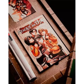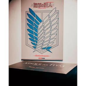 Essa caixa especial contém o mangá Ataque dos Titãs 2 em 1 Vol. 8 (capa variante), 2 postais exclusivos e uma flâmula do brasão da divisão de reconhecimento!