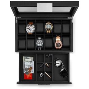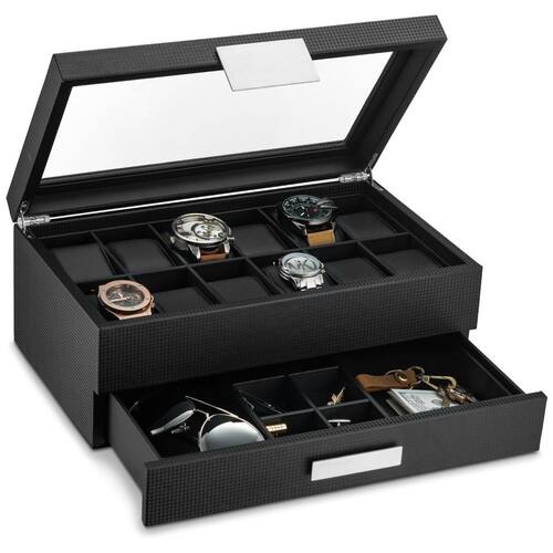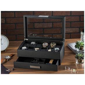 12 COMPARTIMENTOS GRANDES Cada almofada de relógio mantém um relógio pequeno ou grande perfeitamente no lugar. Há muito espaço entre a tampa e as almofadas para acomodar relógios de todos os tamanhos. VALET oferece mais espaço para guardar suas abotoaduras, anéis, prendedores de gravata, óculos de sol, canetas, dinheiro, cartões ou ferramentas de relógio. DESIGN ÚNICO, CONVENIENTE E ATRATIVO A caixa de relógio Glenor Co. possui um design único, bonito e mais conveniente do que as outras caixas de relógio por aí. Nossa talentosa equipe de designers trabalhou duro para produzir o equilíbrio perfeito entre modernidade, sofisticação e classe para criar esta caixa única e sua atraente placa de metal. Ao contrário de outras, nossa caixa pode ser facilmente aberta e fechada com uma mão para o uso mais conveniente. CAIXA DE PRESENTE E CARTÃO EM BRANCO INCLUÍDOS Uma elegante caixa de presente e um cartão em branco estão incluídos em cada caixa de relógio para o presente mais apresentável. Este é um ótimo presente para um pai, namorado, marido, filho, chefe, amigo ou qualquer outro amante de relógios em sua vida. CAIXA DE RELÓGIO GLENOR CO Esta é a caixa de relógio que foi projetada e patenteada pela Glenor Co Marca: Não Informado
