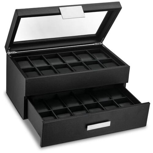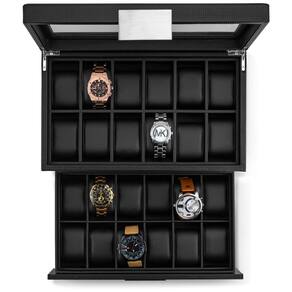24 COMPARTIMENTOS GRANDES Cada almofada de relógio mantém um relógio pequeno ou grande perfeitamente no lugar. Há muito espaço entre a tampa e as almofadas para acomodar relógios de todos os tamanhos. DESIGN ÚNICO, CONVENIENTE E ATRATIVO A caixa de relógio Glenor Co. possui um design único, bonito e mais conveniente do que as outras caixas de relógio por aí. Nossa talentosa equipe de designers trabalhou duro para produzir o equilíbrio perfeito entre modernidade, sofisticação e classe para criar esta caixa única e sua atraente placa de metal. Ao contrário de outras, nossa caixa pode ser facilmente aberta e fechada com uma mão para o uso mais conveniente. CAIXA DE PRESENTE E CARTÃO EM BRANCO INCLUÍDOS Uma elegante caixa de presente e um cartão em branco estão incluídos em cada caixa de relógio para o presente mais apresentável. Este é um ótimo presente para um pai, namorado, marido, filho, chefe, amigo ou qualquer outro amante de relógios em sua vida. SEJA FELIZ Glenor Co oferece uma garantia de devolução do dinheiro de 100 de satisfação para garantir a satisfação total do cliente. Você está garantido para acabar feliz. CAIXA DE RELÓGIO GLENOR CO Esta é a caixa de relógio que foi projetada e patenteada pela Glenor Co Marca: Não Informado