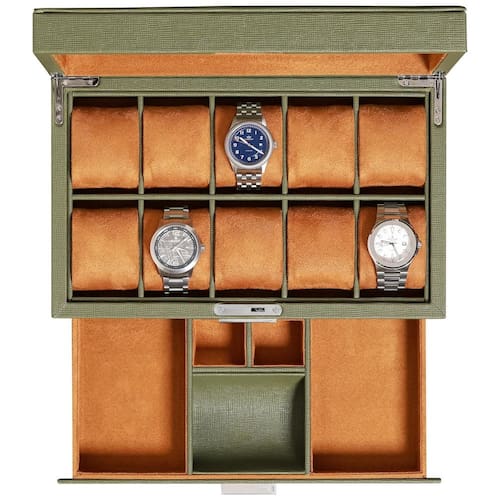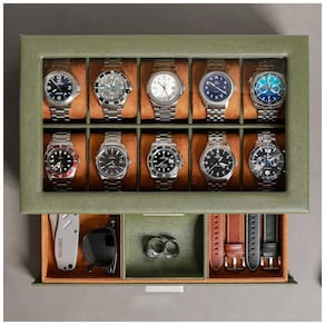 10 COMPARTIMENTOS DE RELÓGIO GRANDES E GAVETA DE VALET Cada almofada mantém um relógio pequeno ou grande perfeitamente no lugar, até um ao lado do outro. Há muito espaço entre a tampa e as almofadas para acomodar relógios de todos os tamanhos. Uma gaveta deslizante pode conter relógios e pulseiras adicionais ou oferece espaço extra para guardar suas abotoaduras, anéis, prendedores de gravata, óculos de sol, canetas, dinheiro, cartões ou suas ferramentas de relógio. QUALIDADE INCOMPARÁVEL E DESIGN SOFISTICADO Nossa caixa possui um design único e moderno que é a combinação perfeita de classe e funcionalidade. Cada caixa usa uma moldura de madeira envolta em couro PU de alta qualidade. O interior é revestido com um elegante tecido de micro camurça bege. PRESENTE PERFEITO Seja um presente de Natal, presente de aniversário para seu marido, presente de aniversário para seu filho, presente de Dia dos Pais para o pai ou mesmo dia das mães, você certamente encantará até o destinatário mais difícil de agradar. Nosso design unissex é perfeito para qualquer colecionador de relógios em sua vida Ou dê a si mesmo Seus relógios merecem Marca: Não Informado