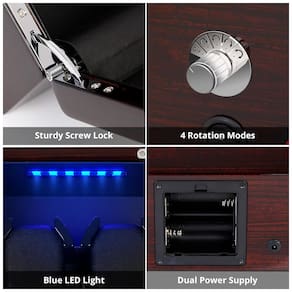 Alta qualidade design humanizado acabamento em grão de madeira de pêra de alto brilho, elegante e com bom toque. Forro interno em PU macio para proteger seu relógio de arranhões. Luz LED azul embutida, conveniente de usar à noite. Almofada ajustável para caber relógios de diferentes tamanhos. Motor super silencioso com menos de 5db A operação do enrolador de relógio é extremamente silenciosa e duradoura. O ruído é inferior a 5db, o que é completamente insignificante. Nunca se preocupe em perturbá lo. Design de 4 modos de rotação Este movimentador de relógio automático possui 4 modos de rotação diferentes para atender às necessidades de diferentes relógios no sentido horário e anti horário gire por 2 minutos, pause por 6 minutos, no sentido horário anti horário gire por 2 minutos, pause 6 minutos e não intermitente no sentido horário anti horário girar por 3 horas, pausar por 9 horas. Ele repetirá as ações acima para garantir que seu relógio continue funcionando Marca: Não Informado