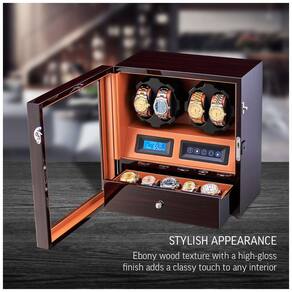 COMPATIBILIDADE UNIVERSAL 2 rotores programados individualmente e 15 programas de corda disponíveis oferecem compatibilidade para todos os modelos de relógio. Você pode definir o número de Turns Per Day de 650 a 1950 TPD. LUZ INTERIOR O movimentador do relógio possui luzes LED integradas. Os relógios ficam especialmente bonitos no escuro. OPÇÃO MOTOR STOP Ao abrir a porta, os rotores são desligados automaticamente. Isso permite que você evite a quebra do mecanismo de corda ao consertar o relógio. O relógio de pulso pode ser instalado ou removido apenas quando os rotores estão parados. TODA A SUA COLEÇÃO DENTRO 4 slots para enrolador de relógios e 5 compartimentos de zenamento de relógios proporcionam máxima usabilidade em um tamanho compacto. O DOOR LOCK permite impedir o acesso indesejado Marca: Não Informado