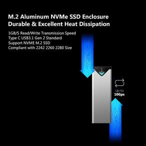?SSD aplicável ?- Este gabinete SSD M.2 apenas para NVMe M-Key M.2 SSD (baseado em PCIE). Aplicável aos tamanhos 2242 / 2260 / 2280 motoristas de estado sólido. Não suporta SSDs baseados em M.2 SATA, SSDs M.2 PCIe AHCI, dispositivos M.2 PCIe, como WiFi e cartões de captura, SSDs mSATA e SSDs não-M.2.interface tipo C?- Ambos os lados podem ser inseridos. USB-C Gen 2 10Gbps ou Thunderbolt 3 são recomendados para desempenho de velocidade extrema. Uma transferência de filme HD leva apenas 2 segundos. Retrocompatível com USB 3.1 Gen1 e USB 3.0 até 5Gbps./Alumínio Luminária Shell?- Adota concha de liga de alumínio, design fino, leve e excelente dissipação de calor, ser portátil e fácil de transportar. O Indicador Azul?- Indicador Azul mostra o estado de transferência de dados, fácil e claro. ?Chip Mestre de alta qualidade?- Adota IC controlador de alto desempenho, cumpre com uasp, trim que pode efetivamente melhorar a velocidade e exteender a vida útil do SSD. Multi OS compatível, ows 7/ 8/ 8.1/ 10/ Linux/ MAC.›Ver mais detalhes do produto