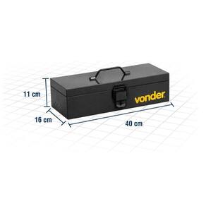 Produzida em estrutura em chapa de aço 1010/1020 e pintura a pó. Possui alça e trava reforçada com porta cadeado. Indicada para acondicionamento de ferramentas e afins. Especificações técnicas: Material:Chapa de aço Tipo:Baú Comprimento:40,0 cm Largura:16,0 cm Altura:11,0 cm Capacidade de carga kgf :15 kgf Cor:Preta Massa aproximada peso :1,2 kg Ean: 7893946026356