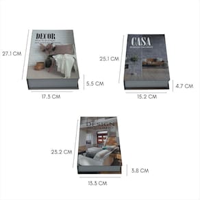 Sofisticação e Estilo para Sua Decoração Transforme seu ambiente com o Conjunto de Caixas Decorativas de Papel. Com imagens realistas e elegantes, este conjunto é perfeito para quem busca um toque contemporâneo e sofisticado na decoração da sala, escritório ou qualquer espaço especial. Um porta objetos elegante para decorar nas prateleiras e mesas. Características do Produto: -Estética moderna com tons neutros e aconchegantes -Inspiração em design de interiores de alto padrão -Um porta objetos leve, prático e fácil de combinar com qualquer ambiente -Ideal para guardar objetos e compor prateleiras, mesas e estantes com charme Seja para criar um espaço mais aconchegante ou dar um toque de requinte ao seu lar, esse conjunto de caixas decorativas é a escolha perfeita para quem aprecia beleza, conforto e estiloEspecificações Técnicas:Cor: DecorMaterial: PapelCaixa 1 - Medidas Aproximadas: Altura: 3,8 cm x Largura: 13,3 cm Comprimento: 23,2 cmCaixa 2 - Medidas Aproximadas: Altura: 4,7 cm x Largura: 15,2 cm Comprimento: 25,1 cmCaixa 3 - Medidas Aproximadas: Altura: 5,5 cm x Largura: 17,3 cm Comprimento: 27,1 cmImagens IlustrativasComposição da Embalagem:3 Caixas Decorativas Marca: Não Informado
