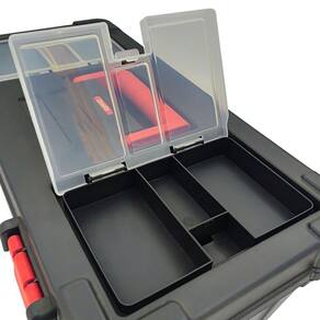 Inclui bandeja removível e compartimentos externos, permitindo separar ferramentas pequenas, como parafusos e brocas, das ferramentas maiores.