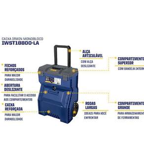 Caixa monobloco com reforçada proporcionando durabilidade, com compartimento grande para armazenagem de ferramentas elétricas, alça articulável com trava deslizante para melhor transporte e fechos reforçados. Possui compartimento superior com bandeja interna, abertura deslizante para facilitar o acesso aos compartimentos e rodas largas ideais para enfrentar diferentes terrenos.