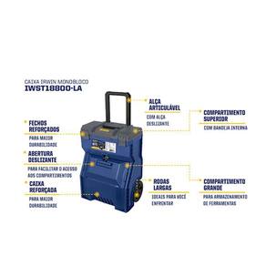Caixa monobloco com reforçada proporcionando durabilidade, com compartimento grande para armazenagem de ferramentas elétricas, alça articulável com trava deslizante para melhor transporte e fechos reforçados. Possui compartimento superior com bandeja interna, abertura deslizante para facilitar o acesso aos compartimentos e rodas largas ideais para enfrentar diferentes terrenos.