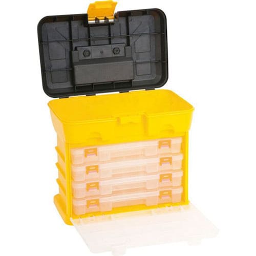 Indicado para organizar e armazenar peças e acessórios em geral. Possui alça para transporte, 4 bandejas móveis e 1 compartimento na tampa. Detalhes Técnicos: Comprimento do organizador para ferramentas: 275,0 mm Largura do organizador para ferramentas: 175,0 mm Altura do organizador para ferramentas: 260,0 mm Material do organizador para ferramentas: Polipropileno Cor do organizador para ferramentas: Preto/amarelo e transparentes Capacidade de carga: 10 kg E CDC : legal: 90 dias Marca: Não Informado