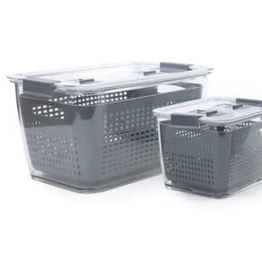 ATENÇÃO: As cores dos produtos podem sofrer variações em função das características do monitor e do celular. Caixa organizadora de geladeira com tampa jogo c/ 3 peças plástico incolor / cinza 15x18,5x29cm jg c/3 pc - cesta interna e trava na tampa, capacidade total 1565ml