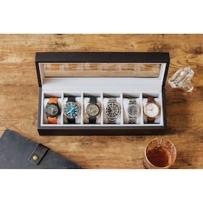 CASE ELEGANCE Organizador de caixa de relógio de madeira maciça expresso com visor de vidro - Dê aos seus relógios uma casa que eles merecem com esta caixa de relógio sólida e elegante. Nosso design refrescante incorpora cuidadosamente sulcos profundos, linhas retas e uma tela de vidro real. - ? Simplificamos o fechamento da caixa do seu relógio com nossa caixa magnética segura para relógio, garantindo que a tampa permaneça firmemente travada no lugar. - ? Nossas almofadas de relógio ultramacias foram projetadas para caber na maioria dos tamanhos e estilos de relógios, incluindo relógios grandes, relógios com pulseiras pequenas e vários outros estilos de relógios masculinos e femininos. - ? A capa elegantemente ajustada é ligeiramente brilhante e combinada com um fundo de feltro preto que evita arranhões na superfície dos móveis. - ? Com seis compartimentos para preencher, agora você tem o motivo perfeito para procurar seu novo relógio.