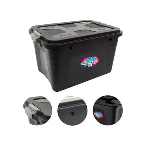 Organização, limpeza e proteção dos itens Tampa e trava para manter os objetos seguros Possibilidade de empilhar uma caixa sobre a outra Capacidade de 56 litros Atóxicas e livre de bpa Dimensões: altura: 34cm largura: 40cm comprimento: 58cm