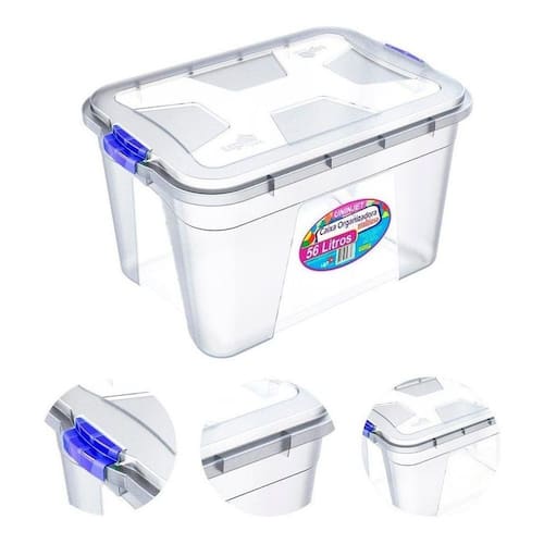 Pontos de valor: Versatilidade: guarda brinquedos, alimentos embalados, documentos, acessórios e muito mais. Transparência: facilidade de visualização do conteúdo sem abrir. Praticidade: material resistente e leve, ideal para levar para onde desejar. Espaço eficiente: 56 litros de capacidade para manter tudo organizado. Segurança: travas que ajudam a impedir aberturas acidentais.